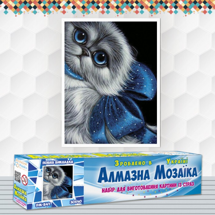 Алмазна вишивка (набір) "Кошеня з синім бантом" (DM-341)