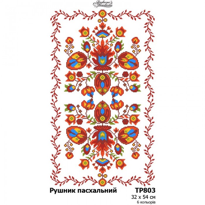 Розмір вишивки 32 см Х 54 см, розмір тканини 36 см Х 60 см. Можливі відхилення у розмірі тканини +/- 3%.