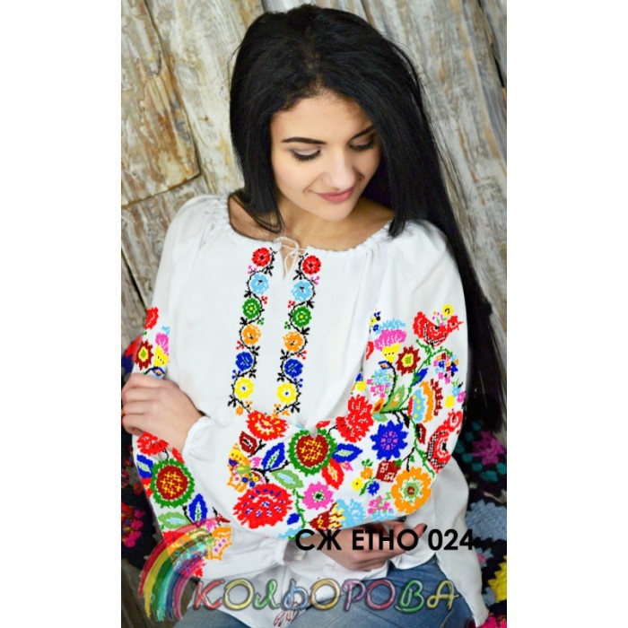 Заготовка для вишивки сорочки жіночої з рукавами в стилі ЕТНО - СЖ-ЕТНО-024 під вишивку бісером або нитками. Заготовка для вишивки бісером або нитками складається з шести відрізів тканини з запасом.