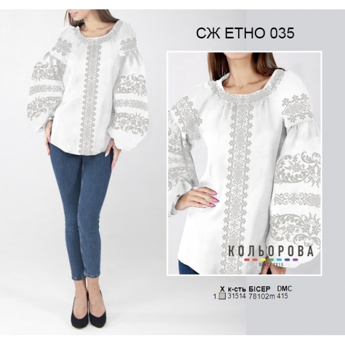 Заготовка для вишивки сорочки жіночої з рукавами в стилі ЕТНО - СЖ-ЕТНО-035 під вишивку бісером або нитками. Заготовка для вишивки бісером або нитками складається з шести відрізів тканини з запасом.