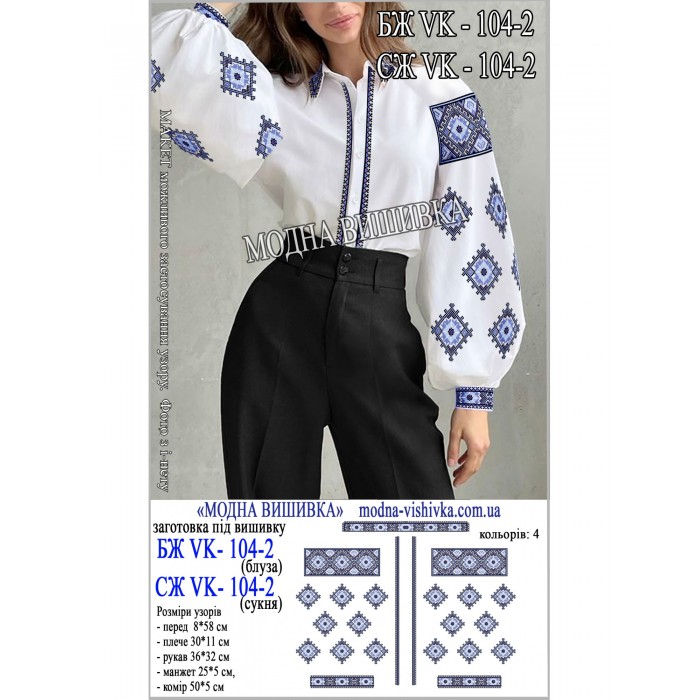 Заготовка на тканині для сорочки жіночої з нанесеною кольоровою схемою, що не змивається і не линяє при пранні.Тип тканини та також колір можна вибрати в опціях товару. Кольори тканин можна переглянути на фото тканин.