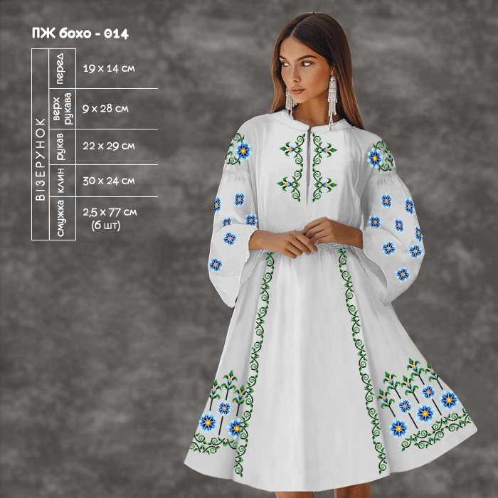 Заготовки суконь в стилі бохо та етно створені з любов'ю до природи та відображають її неповторну красу. Яскраві кольори, які використовуються у вишивці, передають енергію і життєрадісність, а тонкі нитки створюють унікальність кожного виробу. Вишивка на таких заготовках може виконуватися різними техніками - хрестиком, гладдю, шовком, гобеленом тощо.